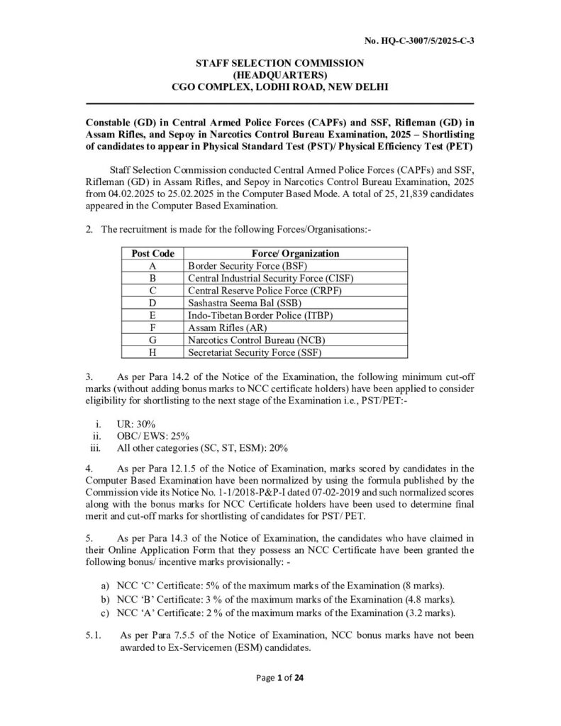 Along with the SSC GD Constable result, the state-wise cut-off marks and merit list have also been released in PDF format. The PDF includes cut-off scores for all states and Union Territories where vacancies were notified.