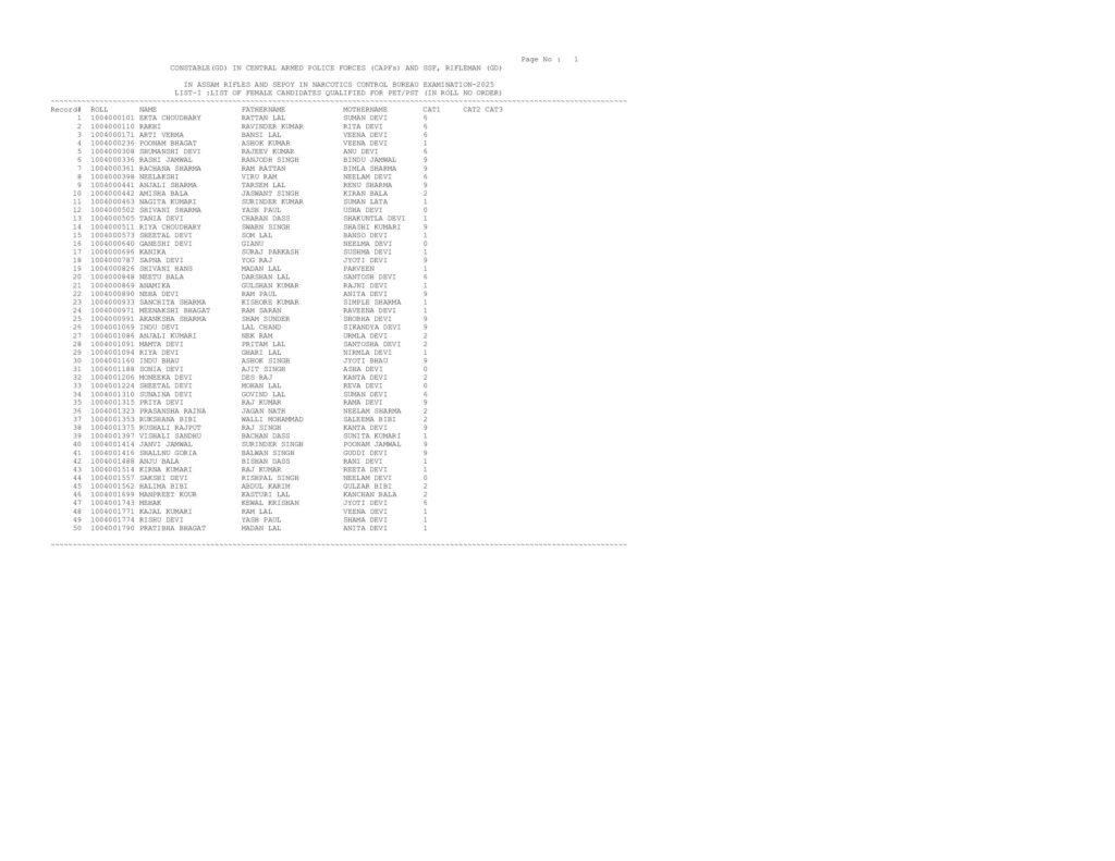 The SSC GD Constable merit list 2025 includes the names, roll numbers, and ranks of candidates shortlisted for the next stage — the Physical Efficiency Test (PET) and Physical Standard Test (PST). These physical tests will be held following the declaration of the Computer-Based Examination (CBE) results.